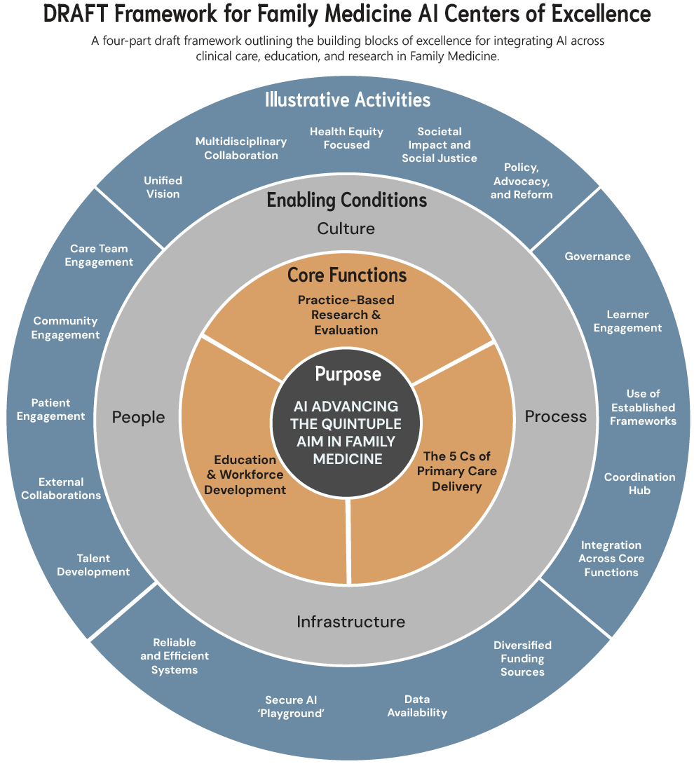 The framework is not intended to be prescriptive. It is the starting point for a practical and adaptable guide, built by and for the family medicine community, to help institutions assess their current capacity, identify gaps, and chart a path toward AI excellence that fits their mission.By design, it emphasizes integration. AI in clinical practice must be connected to research and scholarship. Educational efforts must prepare learners to not just use AI, but to question and lead it. Infrastructure must support thoughtful implementation, ensuring tools reflect family medicine’s core values of equity and relationship-centered care. By anchoring the work in shared values and clear functions, we can support innovation while maintaining a consistent bar for quality and responsibility.To ensure broad impact, the framework is being designed with all of family medicine in mind, especially those in rural communities and in safety net organizations. These settings are central to primary care and often face distinct barriers to AI adoption. The CoE initiative aims to bridge these gaps by fostering mentorship and innovation, sharing resources, and ensuring community-rooted care remains at the heart of AI advancement in family medicine.