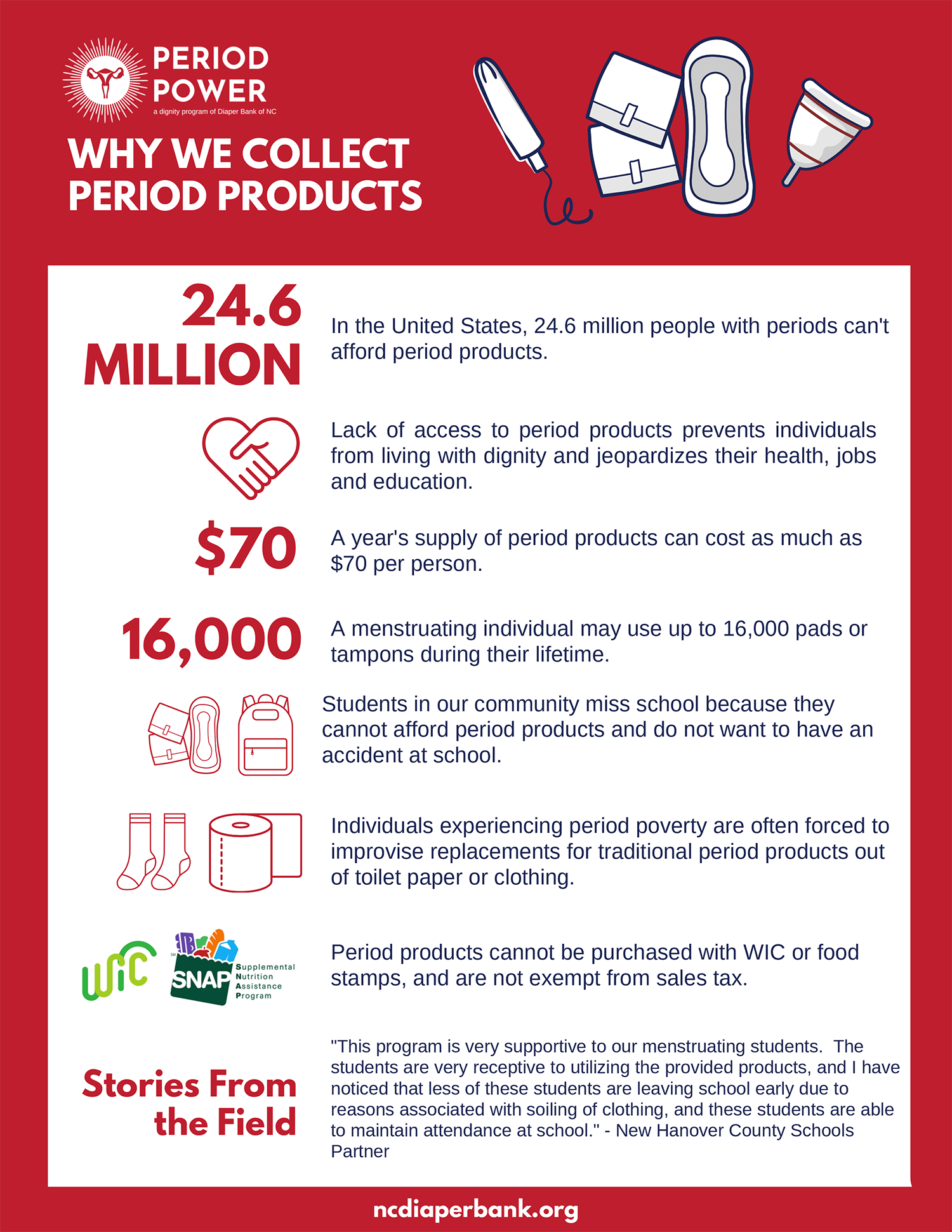 Awareness has grown globally about menstruating individuals struggling because they lack period products. Far less recognized is the impact of this issue right in our own community. A significant portion of low-income menstruating individuals in North Carolina do not have affordable access to the products they need each month.