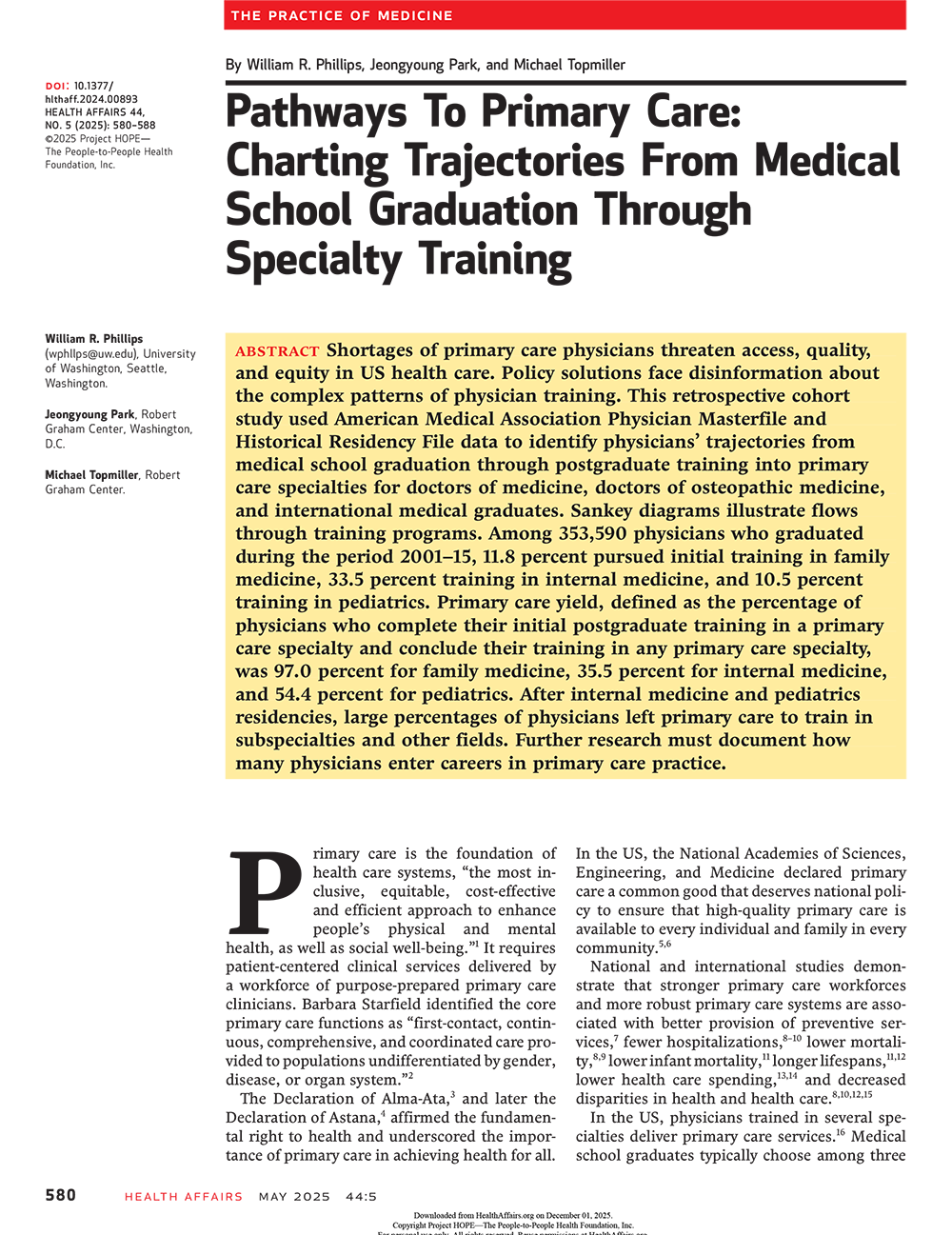“Pathways to Primary Care: Charting Trajectories From Medical School Graduation Through Specialty Training”William R. Phillips, MD, MPH, Jeongyoung Park, PhD, Michael Topmiller, PhDBackground: Shortages of primary care physicians threaten access, quality, and equity in US health care. Policy solutions face disinformation about the complex patterns of physician training.Objective: This retrospective cohort study used American Medical Association Physician Masterfile and Historical Residency File data to identify physicians’ trajectories from medical school graduation through postgraduate training into primary care specialties for doctors of medicine, doctors of osteopathic medicine, and international medical graduates. Sankey diagrams illustrate flows through training programs.Results: Among 353,590 physicians who graduated during the period 2001–15, 11.8% pursued initial training in family medicine, 33.5% training in internal medicine, and 10.5% training in pediatrics. Primary care yield, defined as the percentage of physicians who complete their initial postgraduate training in a primary care specialty and conclude their training in any primary care specialty, was 97% for family medicine, 35.5% for internal medicine, and 54.4% for pediatrics.Conclusion: After internal medicine and pediatrics residencies, large percentages of physicians left primary care to train in subspecialties and other fields. Further research must document how many physicians enter careers in primary care practice.William R. Phillips, MD, MPH, et al. / Health Affairs (2025) 44(5):580–588.